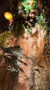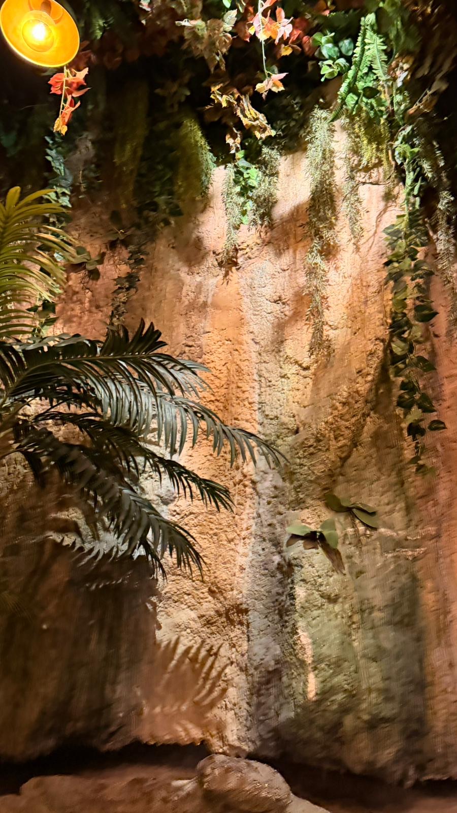 Desde el acceso, el restaurante envuelve al visitante en una atmósfera cálida y acogedora. La abundante vegetación, los tonos naturales, las luces suaves y los materiales orgánicos construyen un entorno que recuerda a un refugio tropical, íntimo y confortable. Todo invita a bajar el ritmo, a sentarse sin prisas y a dejarse llevar por el entorno.