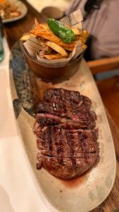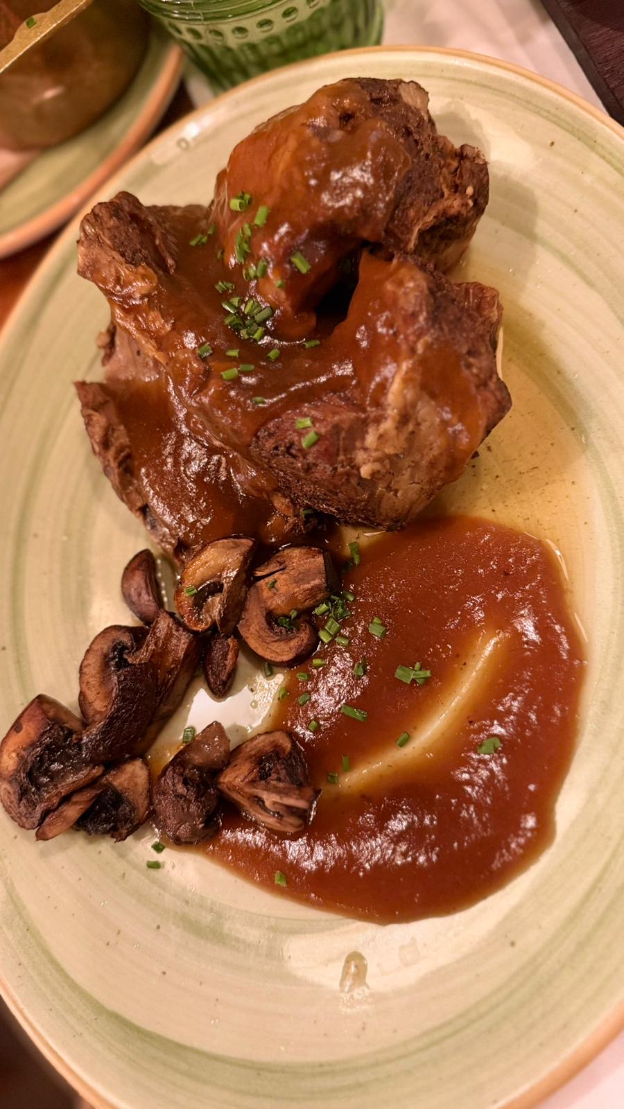 La propuesta gastronómica, tal como se percibe en los platos, apuesta por una cocina honesta, reconocible y bien ejecutada. Las carnes destacan por su presencia y su punto: piezas jugosas, bien marcadas, acompañadas de guarniciones sencillas pero reconfortantes, como patatas doradas y salsas intensas que aportan profundidad y carácter. Es una cocina que no busca artificios, sino sabor.