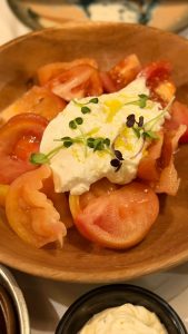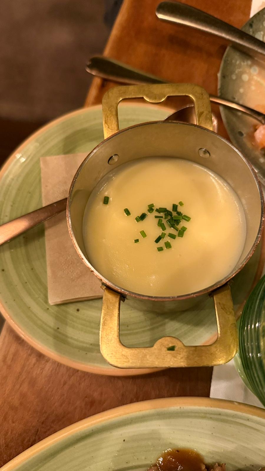 Junto a estas elaboraciones más contundentes, aparecen platos de equilibrio y frescura. Cremas suaves y sedosas, verduras tratadas con respeto y combinaciones donde el producto es el verdadero protagonista. Los tomates frescos con lácteos cremosos y hierbas aromáticas reflejan una sensibilidad por lo simple bien hecho, por los contrastes suaves y naturales.
